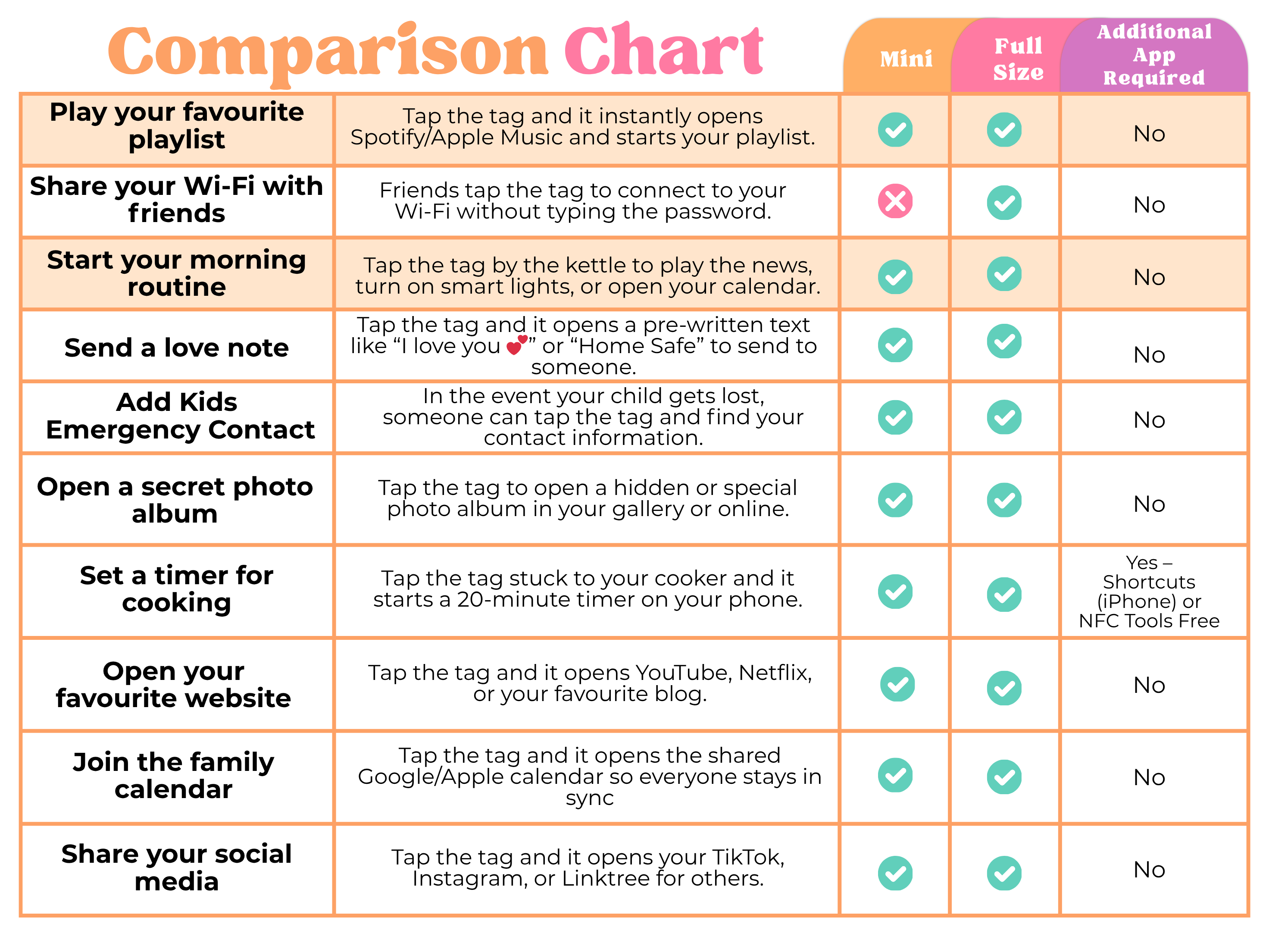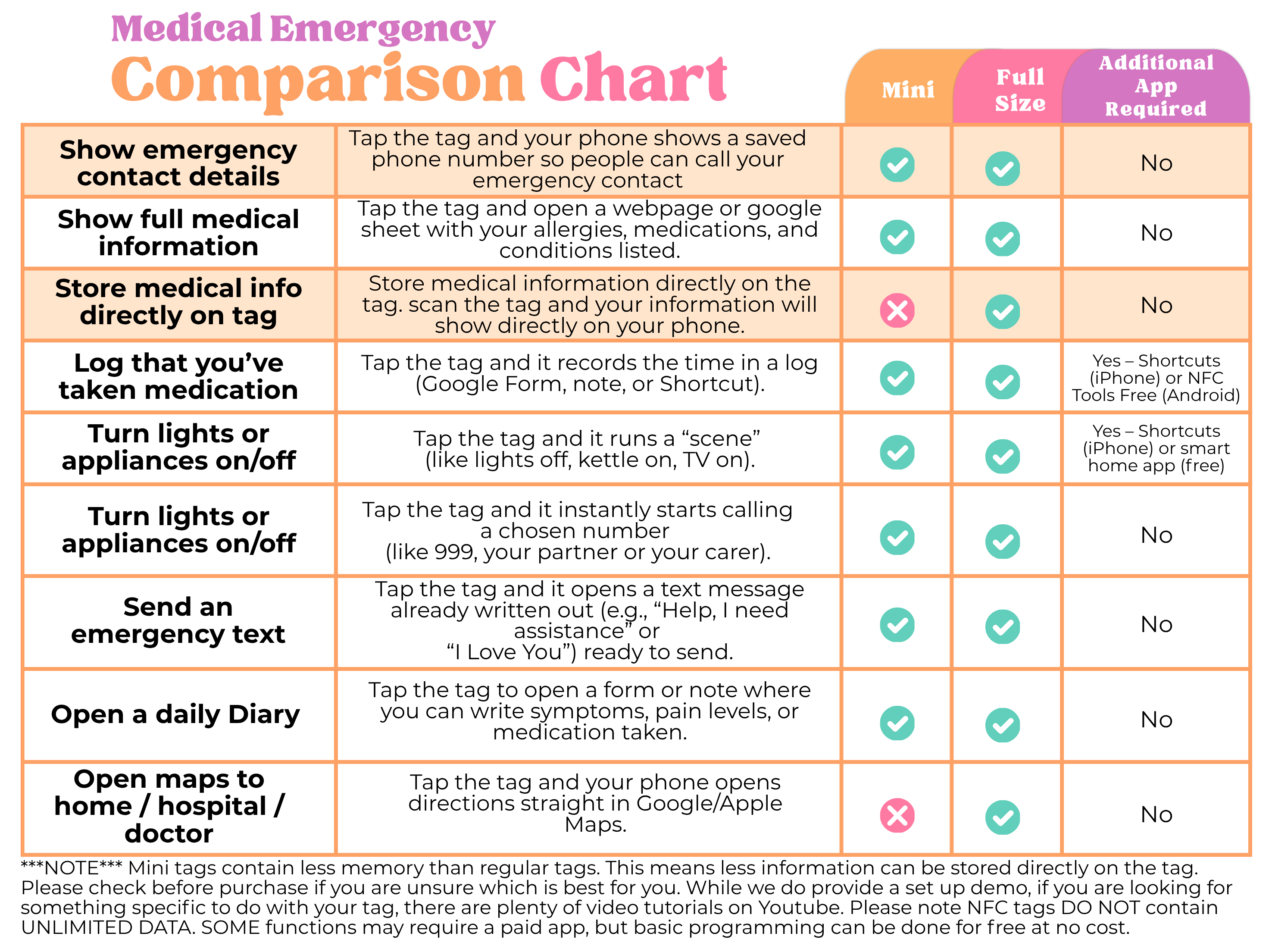 The difference between the two tags comes down to memory. The Mini tags contain less memory capacity than the larger ones. The mini tags can still hold basic emergency contact information such as name, phone number, a short address. They can also hold links (as long as the link isn't too long. To add text information use the "text field rather than the Emergency contact field to get the most space.